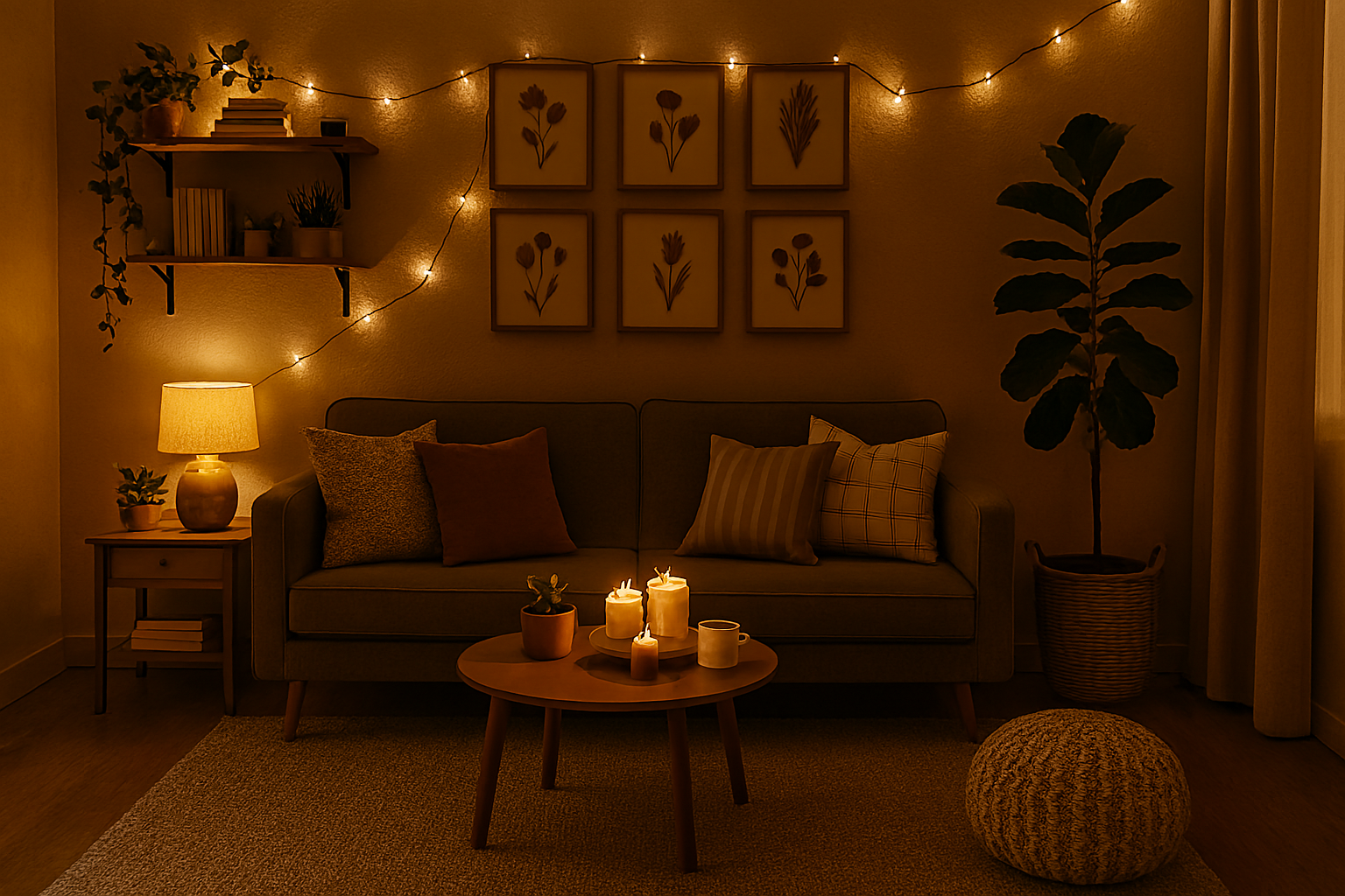 Change harsh overhead lights with softer light sources such as string lights, lamps, or self-made candle holders. The mood of the room may be changed entirely with lighting.